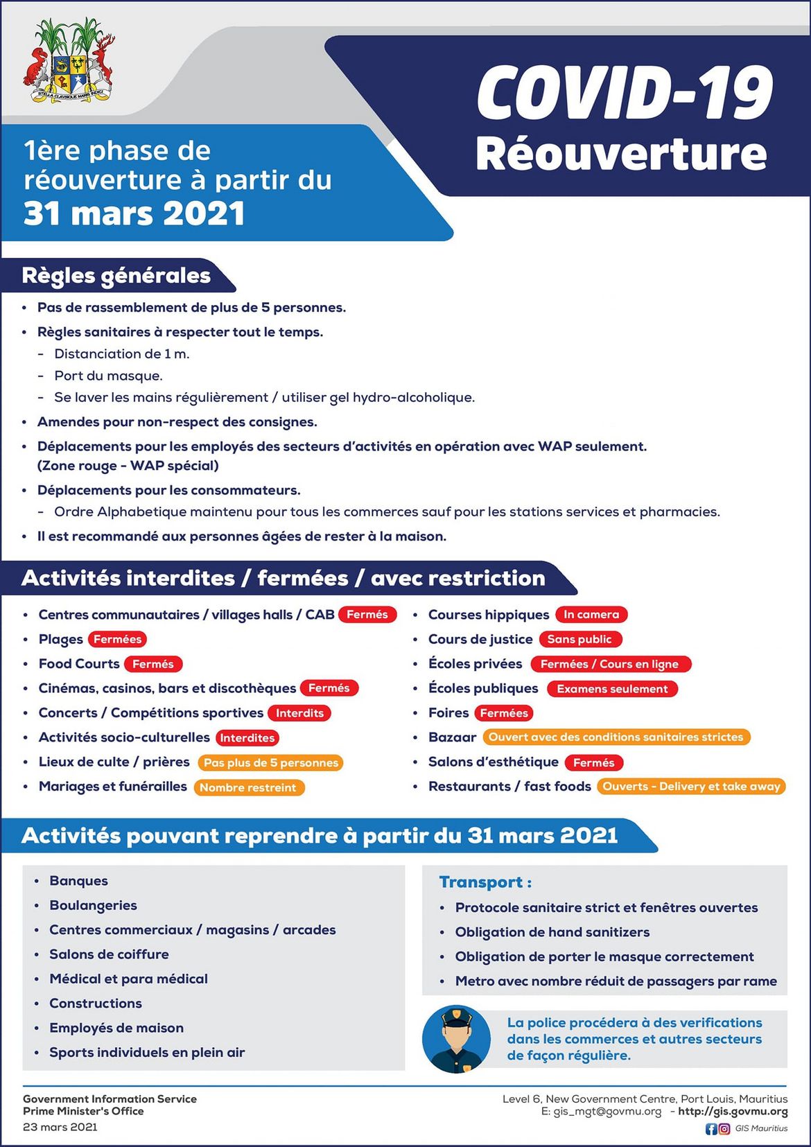 Une première phase de réouverture est prévue à partir du 31 mars 2021 à 20 heures afin de permettre la reprise progressive des activités économiques, a annoncé le Premier ministre, M. Pravind Kumar Jugnauth, lors d'un message télévisé à la nation le mardi 23 mars 2021.