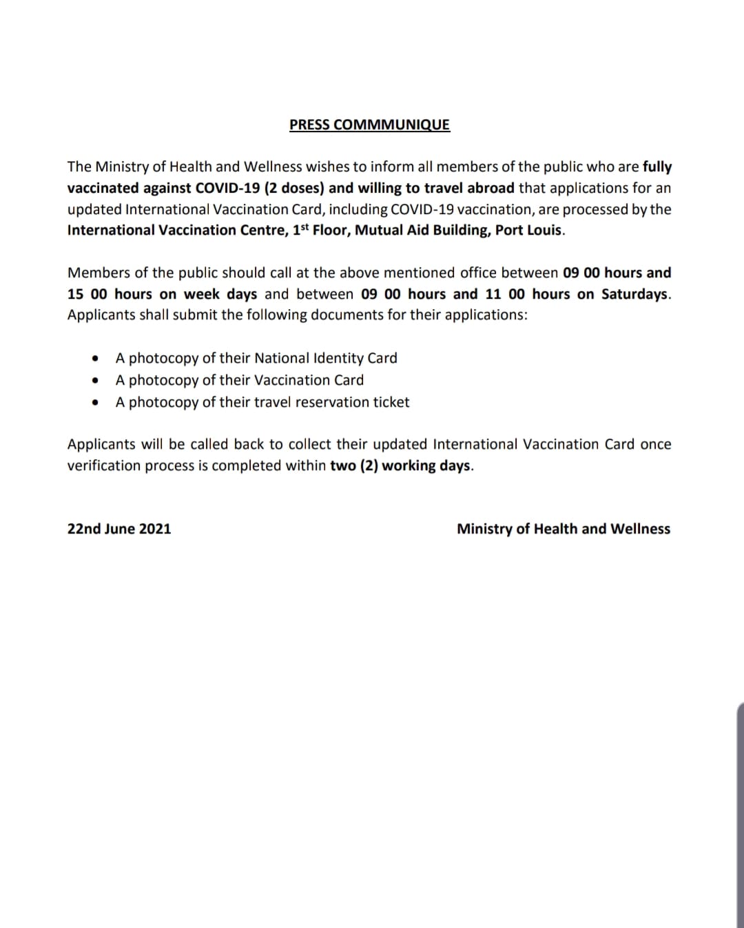Une requête doit être adressée auprès de l’International Vaccination Centre, au 1er étage du bâtiment de la Mutual Aid, à Port-Louis. Le bureau est ouvert de 9 heures à 15 heures en semaine et de 9 heures à 11 heures les samedis.