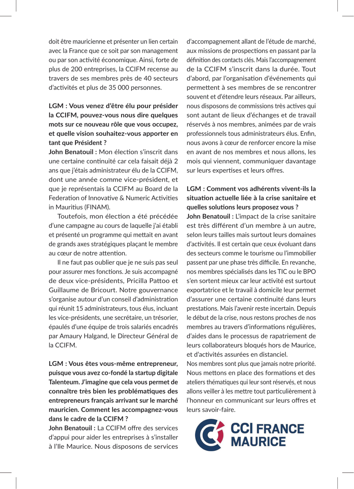 Communication - Presse • La Chambre Paru dans La Gazette Mag | Découvrez l’interview du président de la CCI France Maurice Le 14/06/2021