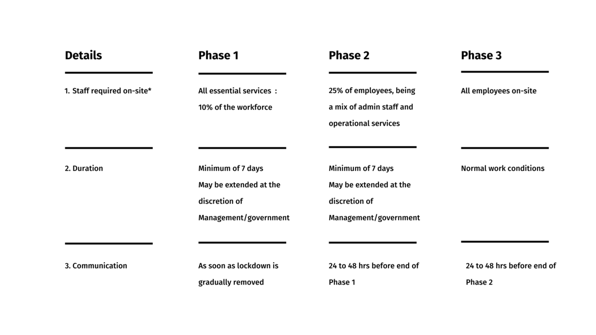 (h) La phase 3 est un retour à la normale avec tout le personnel retournant sur le lieu de travail (bureau ou sur site).