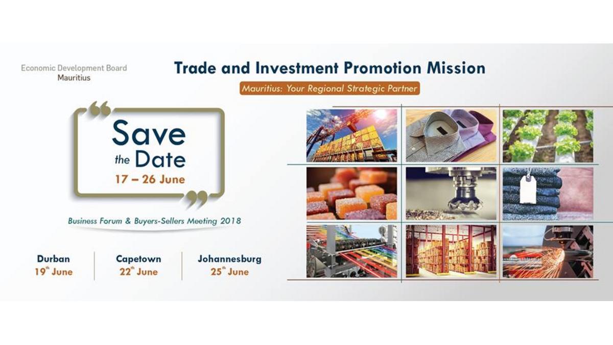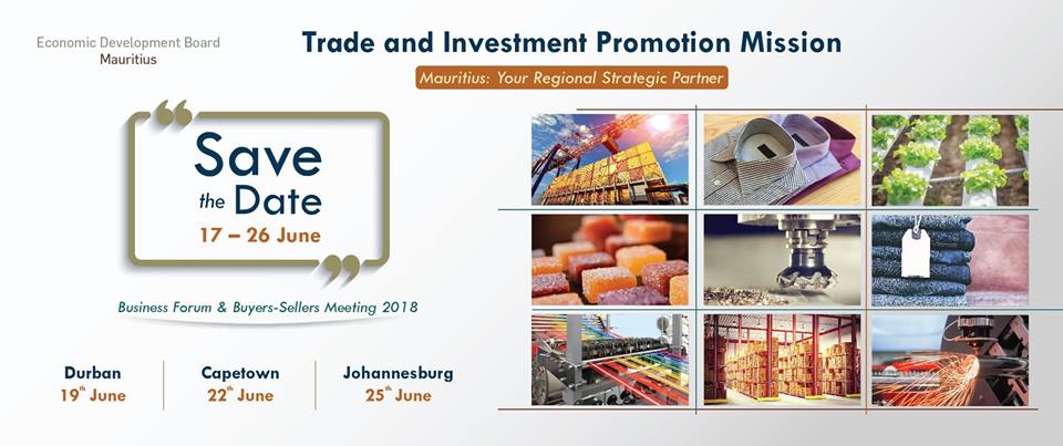 Une délégation commerciale mauricienne composée de fabricants de vêtements, de représentants du Freeport, d'opérateurs logistique et de développement d'infrastructures participeront à une mission officielle conduite par le Economic Development Board du 17 au 26 juin 2018 en Afrique du Sud.