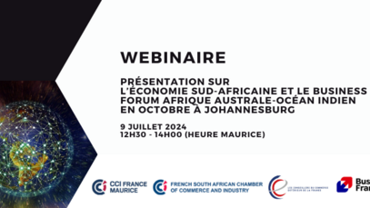 Membres, partenaires et entrepreneurs, La CCI France Maurice, la CCI France Afrique du Sud, les CCE et [...] opportunité unique de découvrir les perspectives économiques et les opportunités d'affaires en Afrique [...] : la présentation sur l’économie sud-africaine et le Business Forum Afrique australe-Océan Indien en octobre